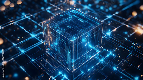 Abstract technological cube blue background concept blockchain systems, cloud computing, data processing, and digital security
