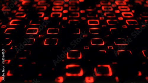Abstract technology background of neon red square shapes with bokeh effect. Computer virus or internet system hacking concept. Computer virus attack, cybersecurity, software hacking.