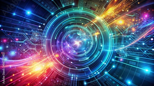 Abstract technology background with glowing circle and binary code.