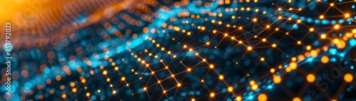 Abstract technology background with glowing dots and lines creating a dynamic digital network pattern. Futuristic data visualization concept.