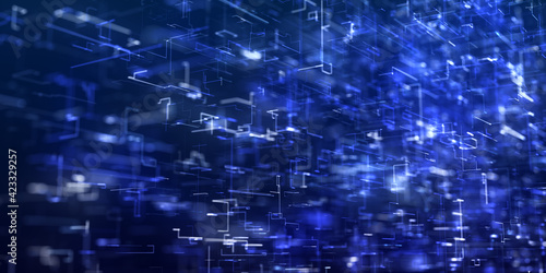 Abstract technology big data background concept. 3D rendering of a scientific technology data binary code network conveying connectivity. Digital cyberspace with particles and Digital data network con