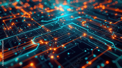 Abstract technology diagram with glowing lines and nodes, dark blue background, vibrant orange and teal, high detail, modern feel