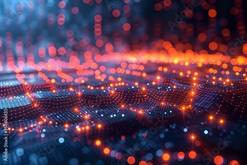 Abstract technology network visualization with glowing orange and blue nodes interconnected by light trails, representing digital connectivity and data flow patterns for tech industry concepts.