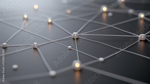 Abstract technology network with glowing nodes and connections on dark surface.