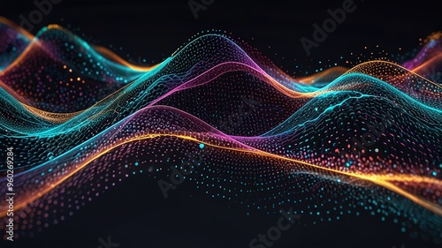 Abstract technology stream background. Digital dynamic wave of dots. Network connection structure. 3D rendering.