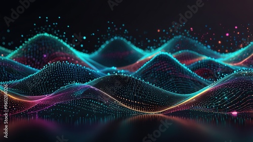 Abstract technology stream background. Digital dynamic wave of dots. Network connection structure. 3D rendering.