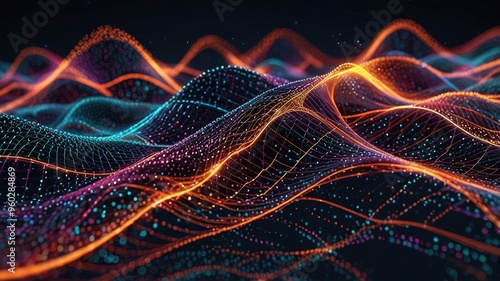 Abstract technology stream background. Digital dynamic wave of dots. Network connection structure. 3D rendering.