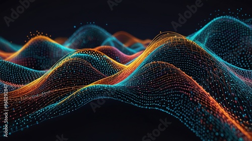 Abstract technology stream background. Digital dynamic wave of dots. Network connection structure. 3D rendering.