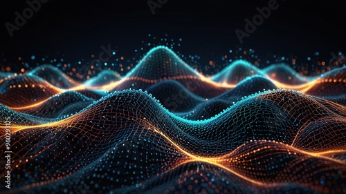 Abstract technology stream background. Digital dynamic wave of dots. Network connection structure. 3D rendering.