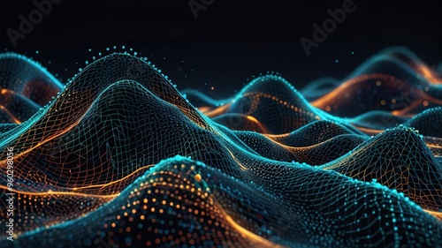 Abstract technology stream background. Digital dynamic wave of dots. Network connection structure. 3D rendering.