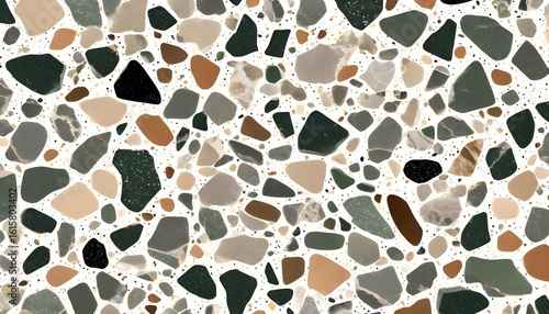 Abstract terrazzo pattern with multicolored stone chips on a white background.