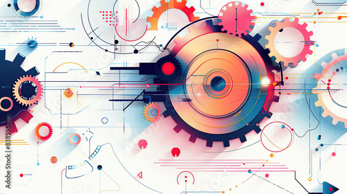 abstract vector illustration of gears and tech elements on a white background, with a pink