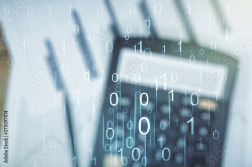 Abstract virtual binary code illustration on calculator background. Big data and coding concept. Multiexposure