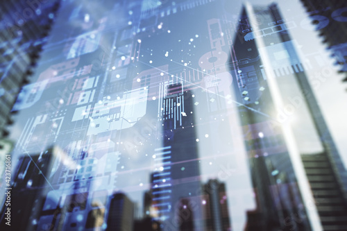 Abstract virtual coding concept on office buildings background. Multiexposure