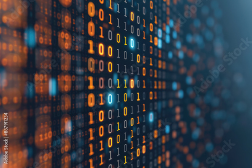 Abstract visual representation of binary code in a virtual space, depicting modern digital information technology and data processing.