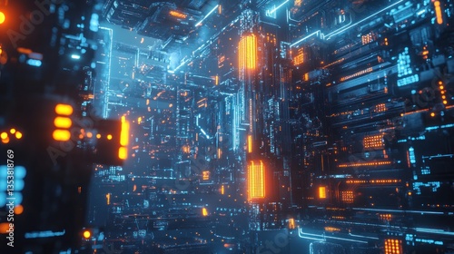 Abstract visualization of a complex futuristic technology with glowing circuitry