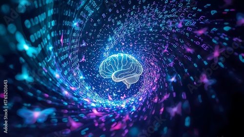 Abstract visualization of a human brain within a swirling vortex of digital data and binary code, representing artificial intelligence and neural networks.