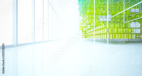 Abstract white and colored gradient glasses interior from array cubes with large window. 3D illustration and rendering.