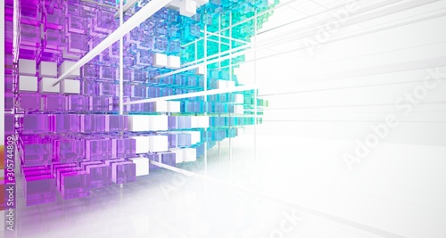 Abstract white and colored gradient glasses interior from array cubes with large window. 3D illustration and rendering.