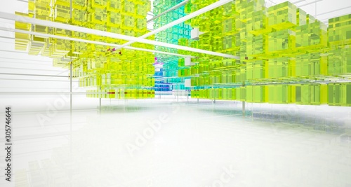 Abstract white and colored gradient glasses interior from array cubes with large window. 3D illustration and rendering.
