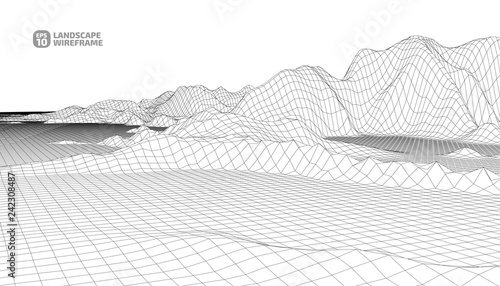 Abstract wireframe background. 3D grid technology illustration landscape. Digital Terrain Cyberspace in the Mountains with valleys. Data Array. | EPS10 Vector.