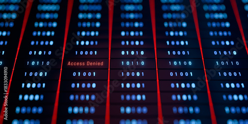 Access denied warning sign, datacenter, data processing, unauthorized access, binary code, supercomputer, big data. System alert, computer crime, network security, cloud server, privacy, technology.
