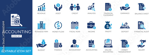 Accounting icon set featuring finance symbols, budgeting, asset, financial, loss, management, profit, revenue, statement, accountant, analysis, balance, and business money management visuals.