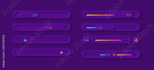 Adjustment panel UI elements kit. Multimedia settings isolated vector icon, bar and dashboard template. Web design widget collection for mobile application with dark theme interface