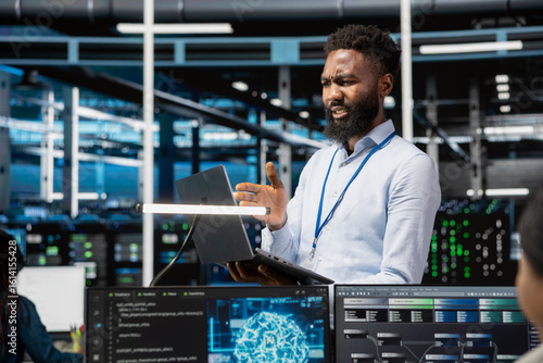 Admin in data center using artificial intelligence computerized model perplexed by glitches affecting equipment. Frowning server room employee upset by broken AI machine learning algorithms