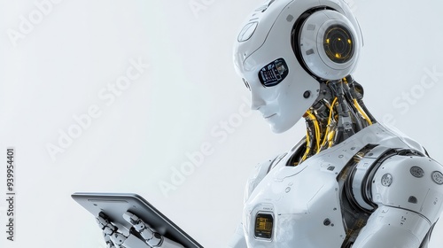 Advanced AI robot using a tablet for data analysis, white background, futuristic design