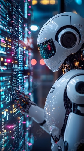 Advanced AI system monitoring IT vendor risks, office filled with innovative tech gadgets