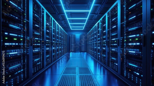 Advanced blue-lit server room with ceiling grid lights and organized racks, perfect for visuals related to data infrastructure, cybersecurity, and cloud-based technology platforms