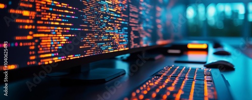 Advanced coding holograms, glowing algorithms, digital workstation, high-tech setup