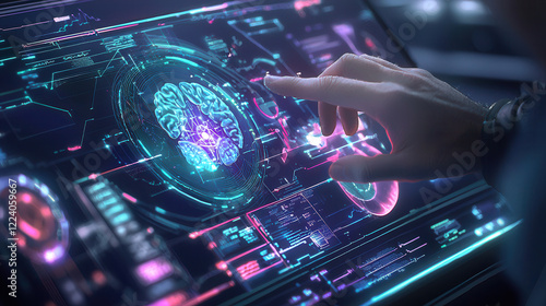 Advanced computer screen displaying brain interface technology, showcasing vibrant graphics and data analysis, evoking sense of innovation and