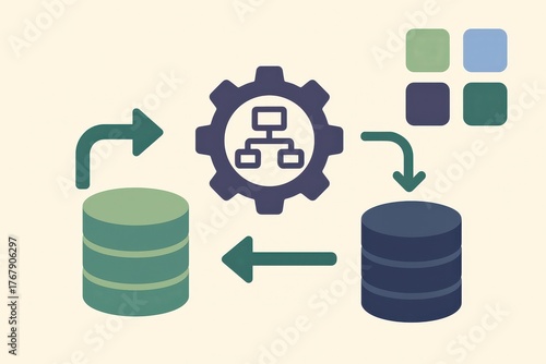 Advanced data exchange represented through visual symbolism includes interconnected databases, workflow processes, and color-coded elements demonstrating innovation and structure in information