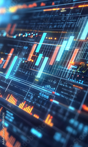 Advanced futuristic trading interface with chart analysis displays and complex grid systems.