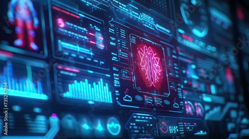 Advanced graphical user interface displaying brain activity and vital statistics, reflecting cutting-edge medical technology and diagnostics.