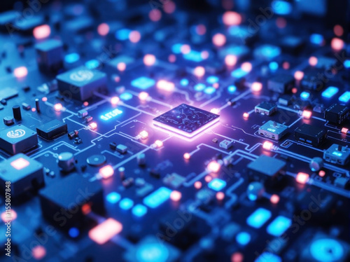Advanced Innovation Technology Concept Visualization of Circuit Board CPU Processor Microchip of Neural Networking and Cloud Computing Data. Electronic circuit board close up. 3D Digital microcircuit