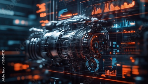 Advanced Machine Engine: Futuristic Design with Digital Interface and Complex Mechanics, Displaying Data Metrics and Technological Innovation.