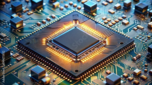 Advanced microchip with intricate circuitry and tiny components illuminated on a powerful computer board with AI technical details.