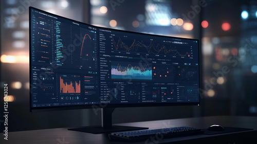 Advanced network dashboard on a computer monitor displaying real-time analytics, detailed graphs, and system health indicators for IT systems