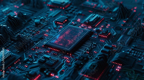 Advanced processor chip on a futuristic circuit board with glowing red lights