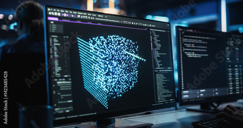 Advanced Quantum Computing Data on Computer Screen. Close Up on Computer Display of an Engineer Developing Solutions for a Quantum Computer Hardware