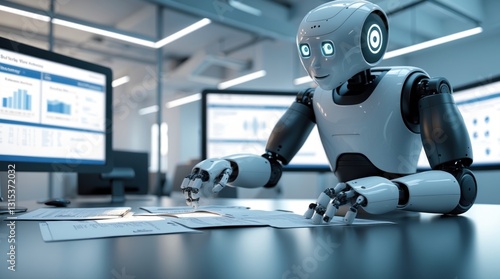 Advanced Robot in Modern Office Setting, Analyzing Documents and Data on Computer Screens
