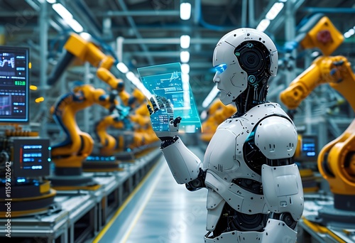 Advanced robot interacting with control panel in high-tech automation facility during daytime operations