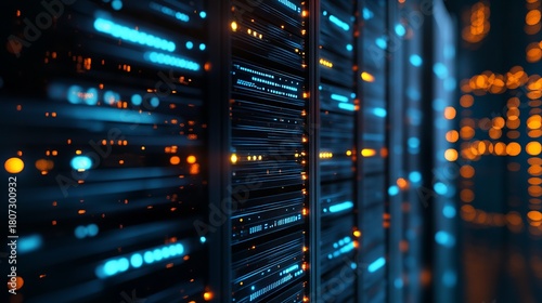 Advanced server room with data streams pulsing through the network, representing big data, ai, machine learning, and modern technology solutions
