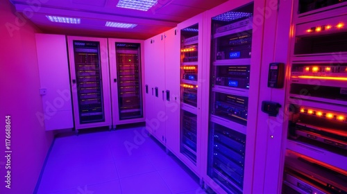 Advanced Server Room with Glowing LED Indicators and Data Storage