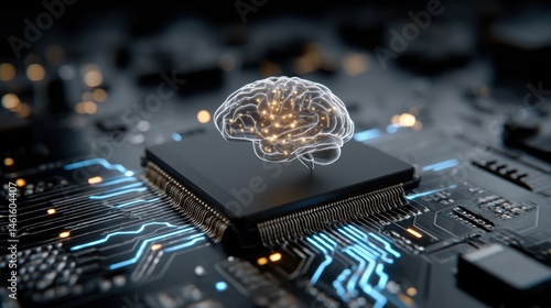 Advanced technology concept: microchip and circuit board with digital data lines moving, AI and cloud computing visualization