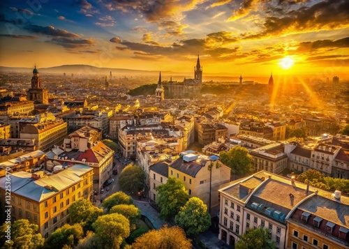 Aerial Cityscape: Stunning High-Angle View of Urban Skyline at Golden Hour