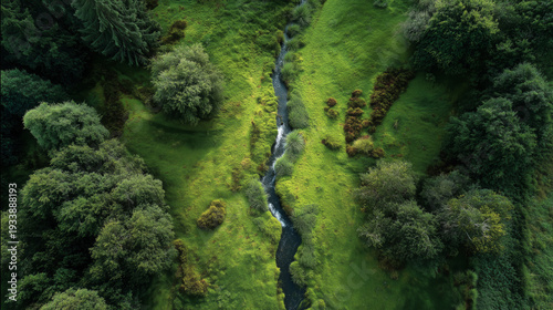 Aerial drone view of a winding river flowing through lush green hills and dense forest.
